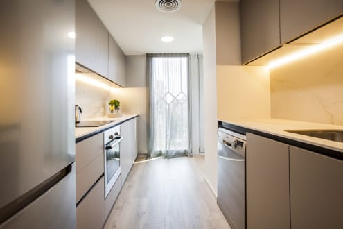 El salón comedor se encuentra en la esquina del edificio lo que hace que junto a los grandes cristaleras lo haga muy luminoso y disfrute de fantásticas vistas. Cocina totalmente equipada con vitrocerámica, lavavajillas, lavadora/secadora y todos los utensilios de cocina que usted pueda precisar.
